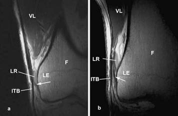 Zdjęcia rezonansu magnetycznego ukazujące włókniste pasma (oznaczone strzałkami) przytwierdzające pasmo do bocznego nadkłykcia (LE) kości udowej (F).